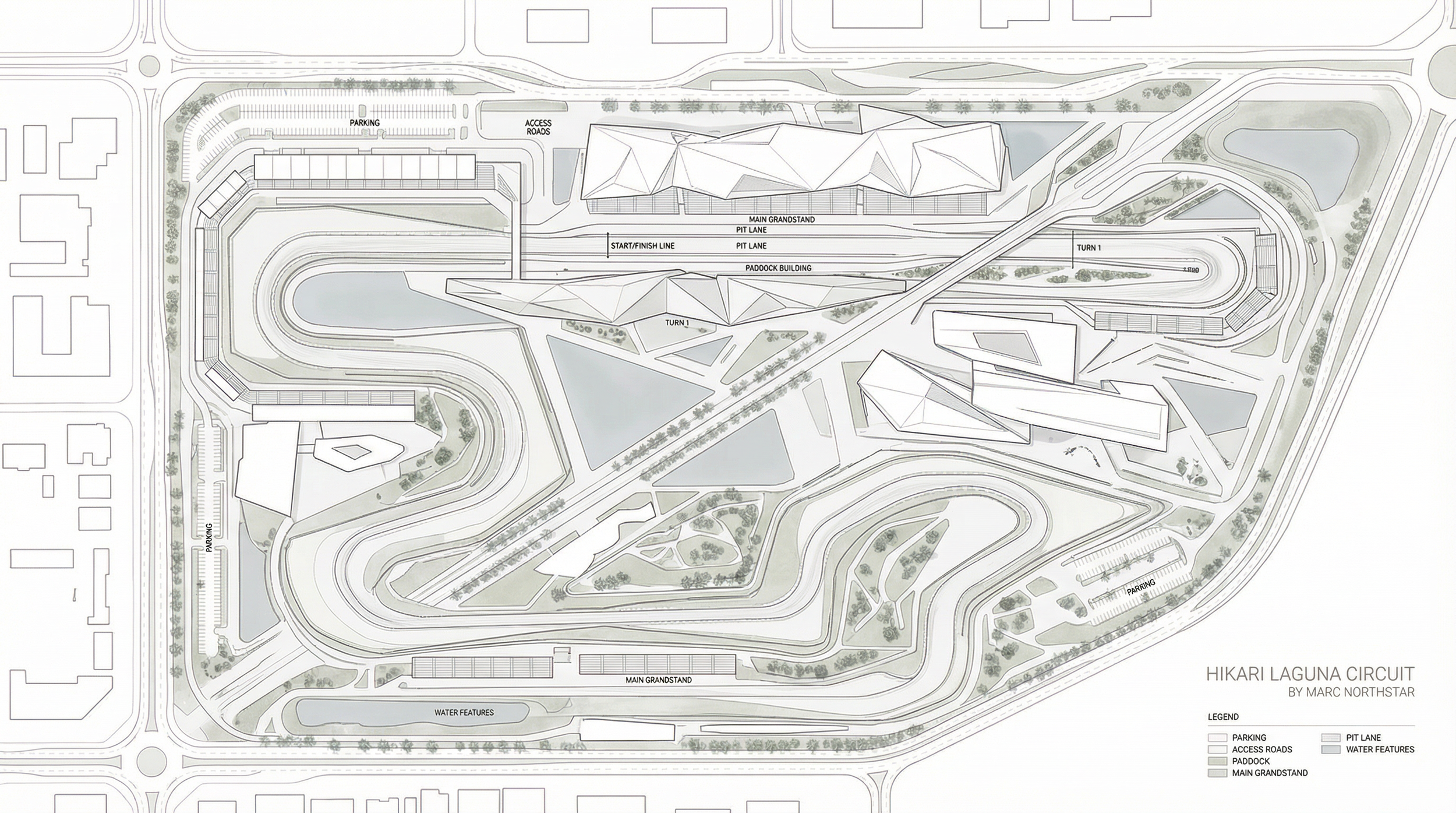Hikari Laguna Circuit is a visionary motorsport destination where beautiful engineering meets sculptural architecture. Conceived as a next-generation Grand Prix venue, the circuit integrates high-performance racing infrastructure with a masterplanned landscape influenced by the clarity and restraint of contemporary West Coast design.